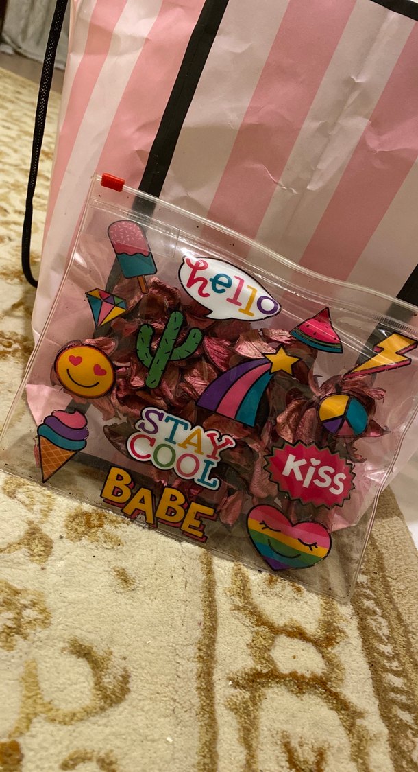Parlak plastikten yapılmış, "BABE" ve "Kiss" gibi pop kültür desenleri bulunan renkli kadın makyaj çantası. Bohem ve retro tarza uygun. İçinde kurutulmuş gül yaprakları ile birlikte satıyorum. Marka temsilidir. #hm #bershka