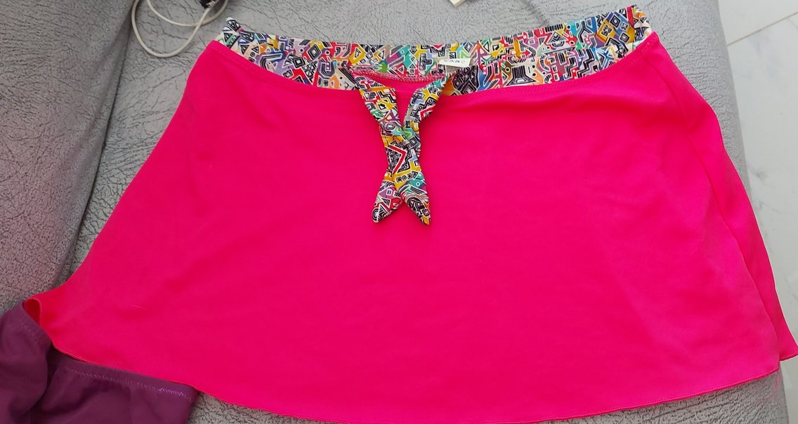 Uzun kesim, canlı pembe zemin üzerine renkli tie-dye desenli bel ve fiyonk detayıyla avant-garde pop kültür tarzında kadın mayo etek