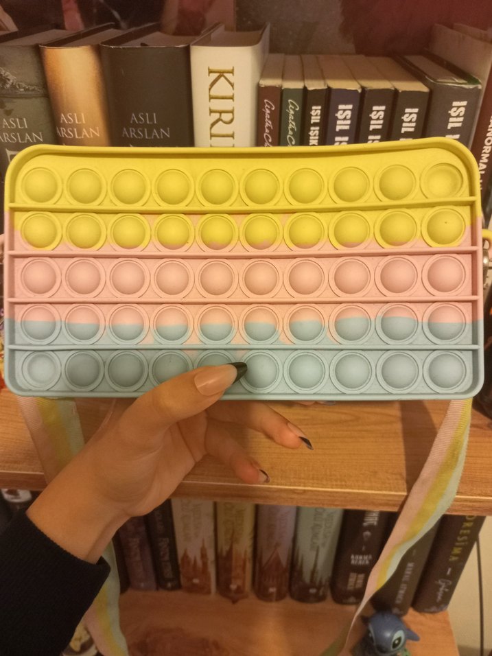Pastel renklerde, çok renkli popitli, plastik cocuk clutch çanta. Annem küçükken almıştı eşyalarımı toplarken gözüme çarptı. Sadece küçük bir çizik var oda asetonla gider. İndirim yapilir