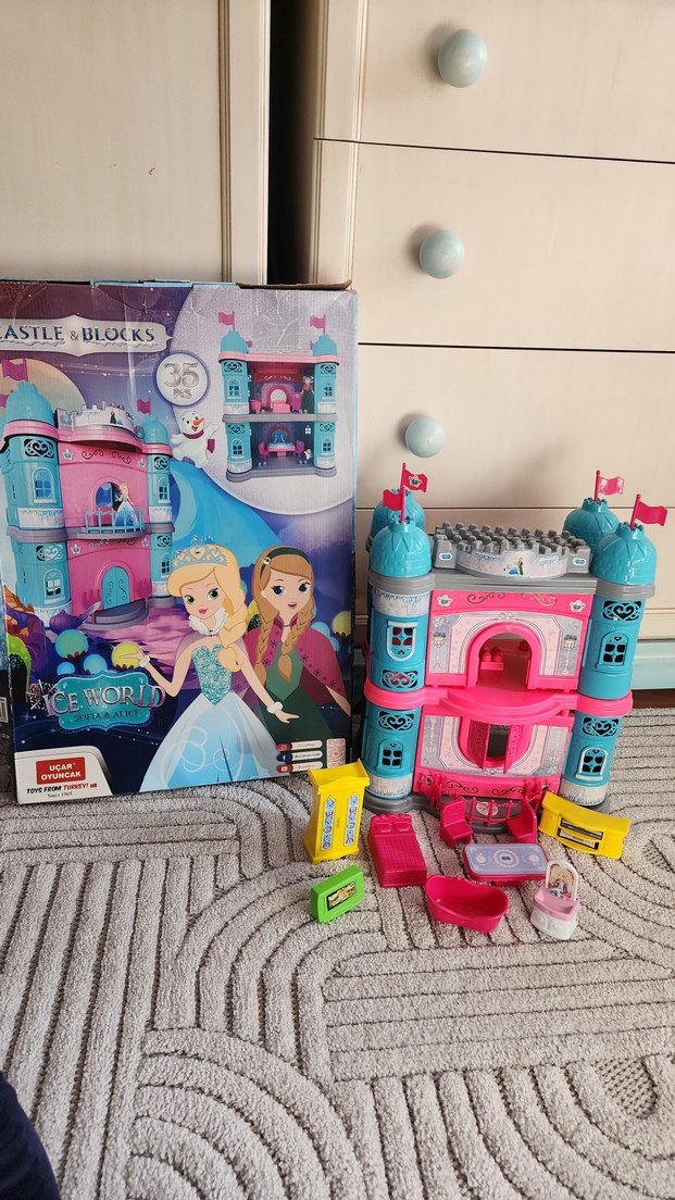 Canlı pembe ve mavi renklerde, aksesuarlarla birlikte prenses şato oyuncak seti. Küçük mobilyalar ve bayraklar içerir. görünen parçaları kadardır, kutuludur!30×40 cm boyundadır!