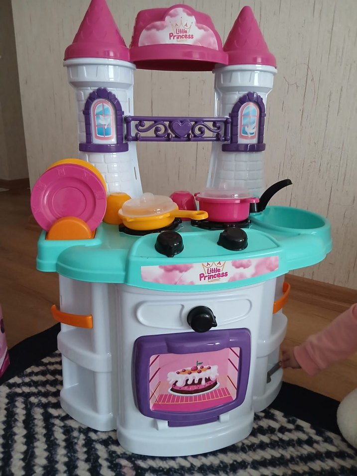 Renkli pembe çocuk oyun mutfağı seti, kale kuleleri, ocak, fırın ve oyuncak tencere tava içerir. Prenses taç aksesuarı da dahildir. buyuk boy