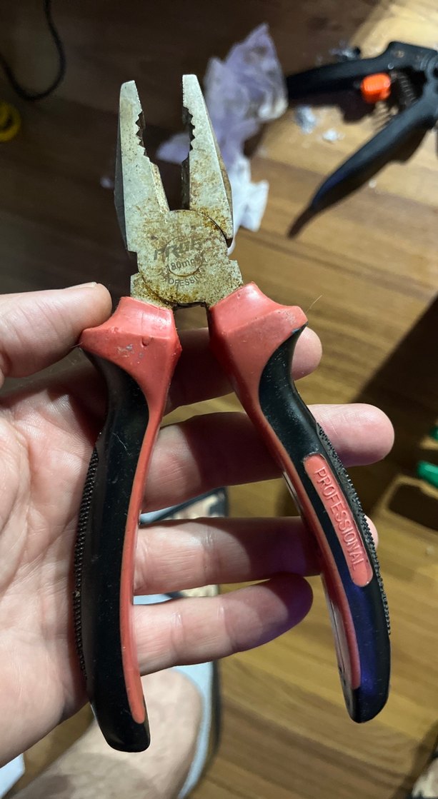 Renkli, kırmızı-siyah saplı profesyonel pense, kavrama için dokulu yüzeye sahiptir ve dayanıklıdır.