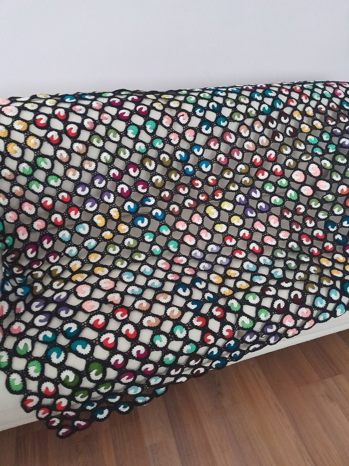 El örgüsüdür. Canlı çok renkli puantiyeli desenli battaniye, odanıza neşeli bir dokunuş katar. ️ Boy:210 En:150