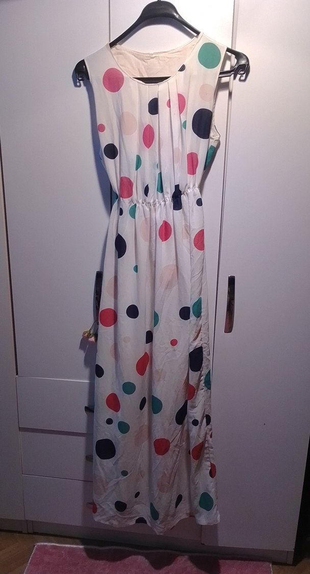 Kolsuz, bol kesim ve drapeli uzun elbise. Çok renkli puantiyeli deseni ve bazı lekeleri mevcuttur