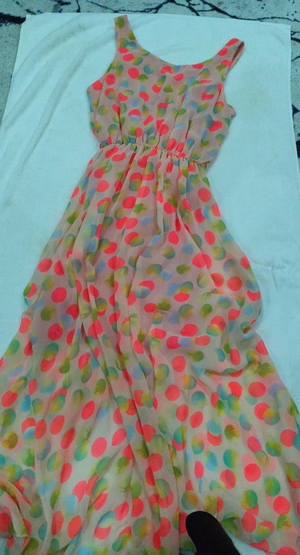 Kolsuz, bol kesim ve drapeli tasarıma sahip bohem uzun elbise. Pastel renklerde çok renkli puantiyeli, yumuşak sentetik kumaştan üretilmiştir. Yuvarlak yaka, açık hava için uygun. tril tril kumaş yazlık