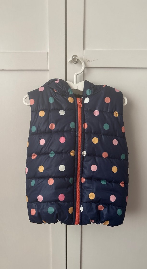Yüksek yakalı, fermuarlı ve kolsuz bu yelek, renkli puantiyelerle desenlenmiş hafif dolgulu ve rahat bir yapıya sahiptir.