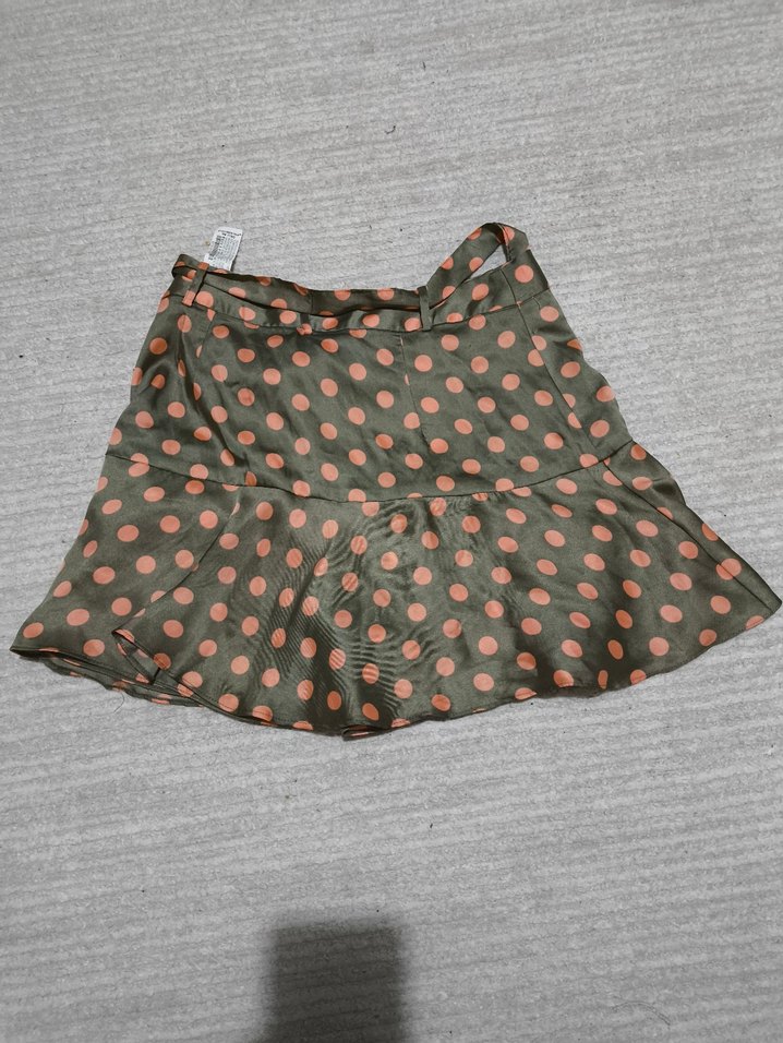 Rahat kesim, kahverengi ve gri puantiyeli, fırfır detaylı midi etek. Yumuşak sentetik kumaştan, gündelik dış mekan kullanımı için uygun.