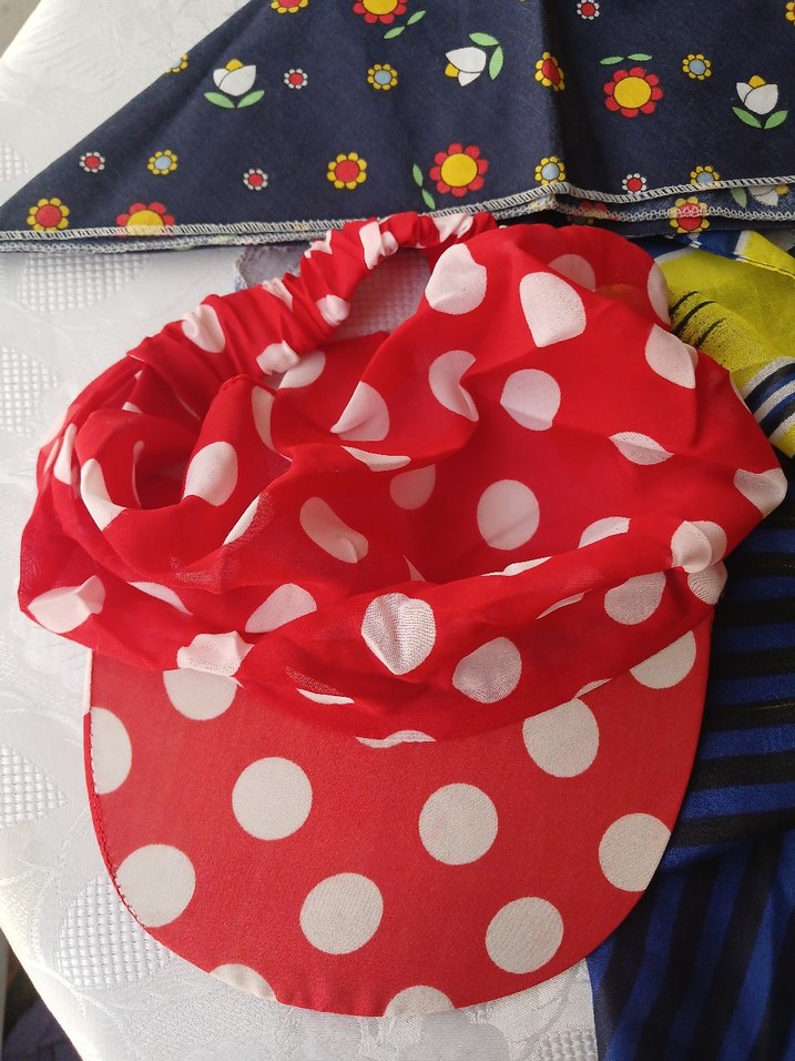 Bu renkli, büyük beyaz puantiyeli kırmızı tabana ve rahat bir uyum için lastikli bant içerir. Renkli Puantiyeli genç kız şapkası, Karadeniz boncuklu eşarp, bant, ve kot ve çiçek desenli bant eşarp.. hediyelidir