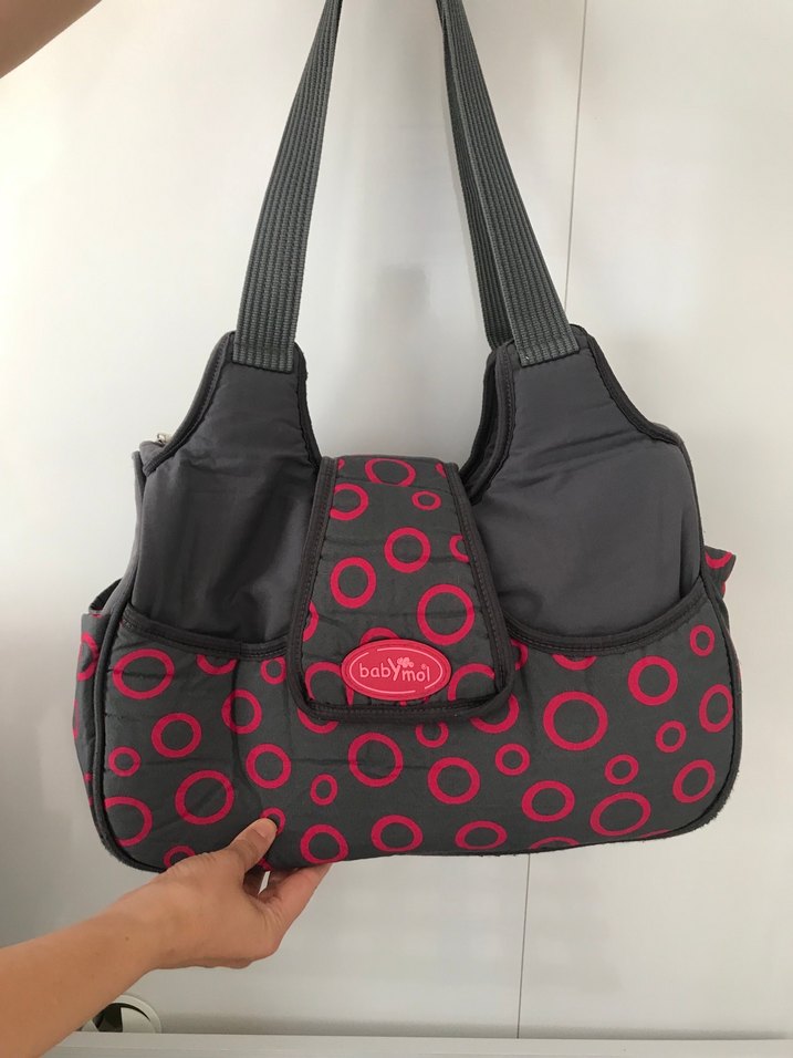 Gri renkte, renkli pembe puantiyelerle desenlenmiş, çok bölmeli ve sağlam askılı bebek çantası.