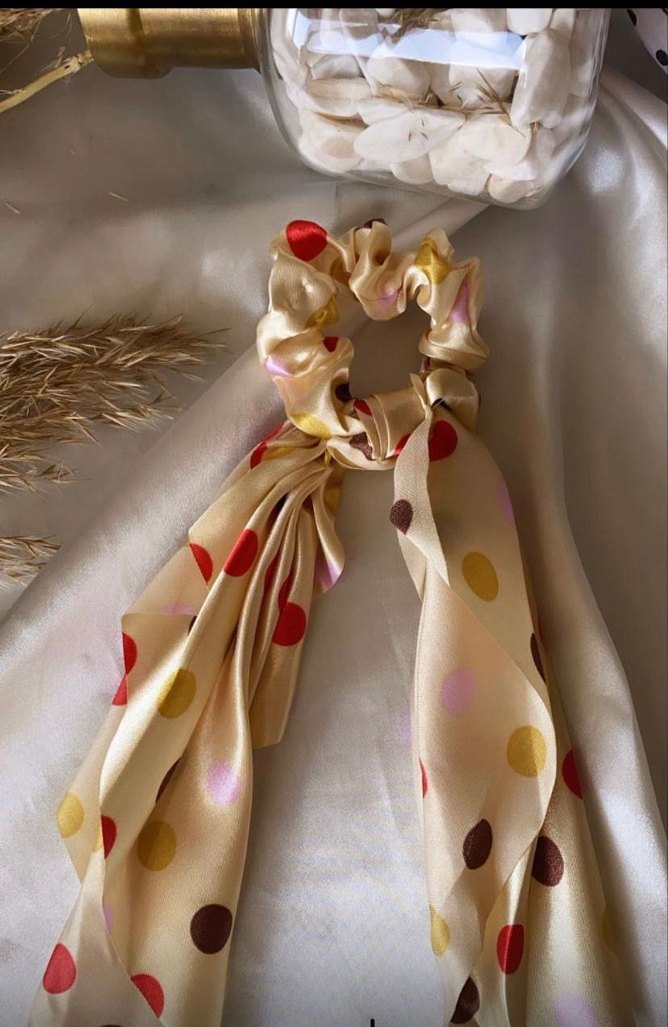 İpek dokulu, renkli puantiyeli fularlı saç tokası, bohem Paris tarzına yumuşak ve şık bir dokunuş katar.
