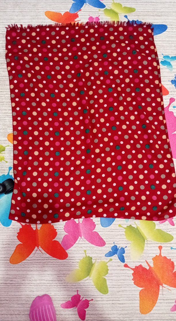 Sentetik kumaştan, çok renkli puantiyeli desenli kırmızı tabanlı kadın eşarp.