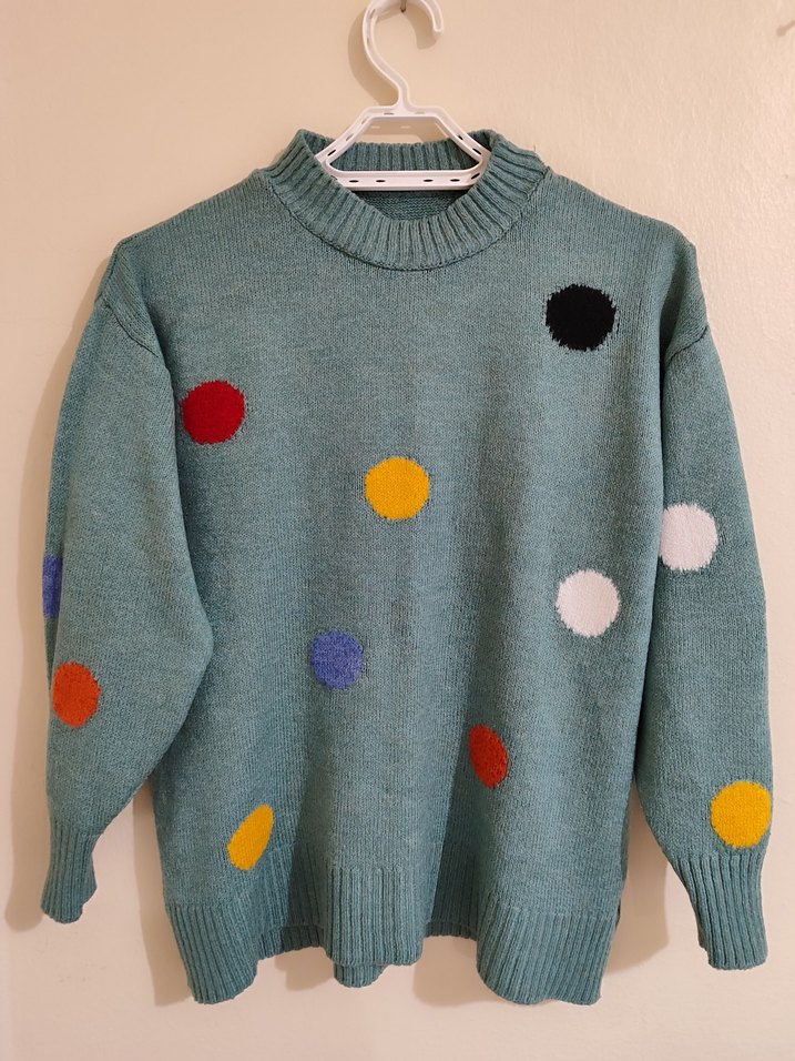 Yuvarlak yaka ve uzun kollu, bol kesim örgü oversize kazak. Pastel çok renkli puantiyeli deseniyle rahat ve trend bir günlük stil sunar.