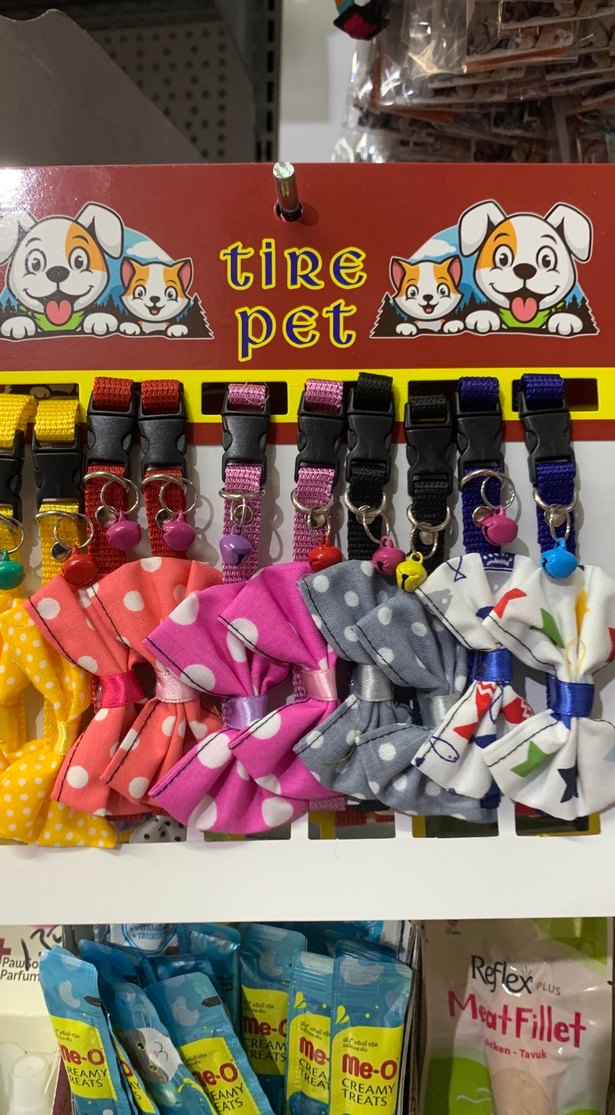 Renkli puantiyeli fiyonk ve küçük zillerle süslenmiş, ayarlanabilir plastik tokalı kedi boyun tasması. TEKLİ FİYATIDIR