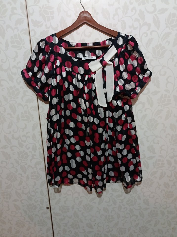 Kadın bluz, bol kesim, kısa kollu ve yuvarlak yaka. Renkli puantiyeli desen ve yakada düğmeli fiyonk detayı bulunur. Sentetik kumaştan yapılmıştır.