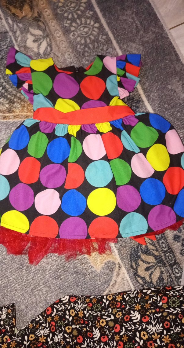 Renkli büyük puantiyelerle, sentetik kumaş, fırfırlı kollar ve bol kesimle retro tarzda kız çocuk elbisesi.