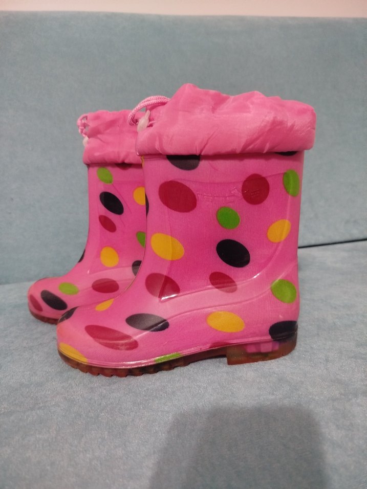 Pembe renkli ve renkli puantiyeli kız çocuk yağmur çizmesi, bağcıklı üst kısmı ile bohem ve retro tarzları yansıtıyor. 29 no