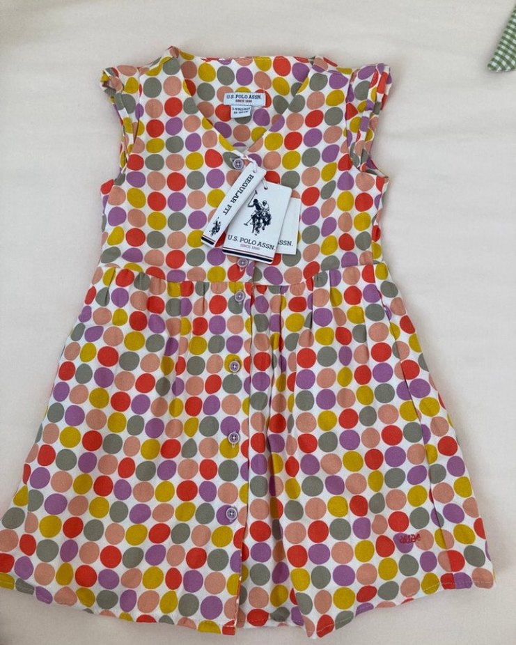 Renkli puantiyeli, kolsuz kız elbisesi, düğmeli, V yaka ve bol kesimdir. Yumuşak sentetik kumaş etiketli ürün hiç giyilmedi