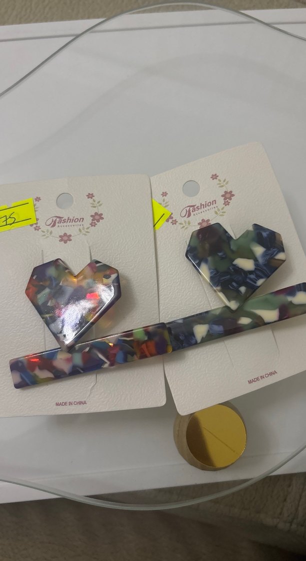 Pul detaylı, çok renkli plastik saç aksesuarları; kalp şeklinde toka ve uzun klips, vintage bohem tarzında.