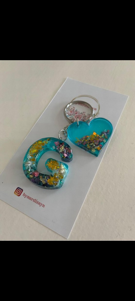 Bohem tarzda, pul işlemeli, renkli turkuaz reçine kalp ve G harfi şeklinde anahtarlık.