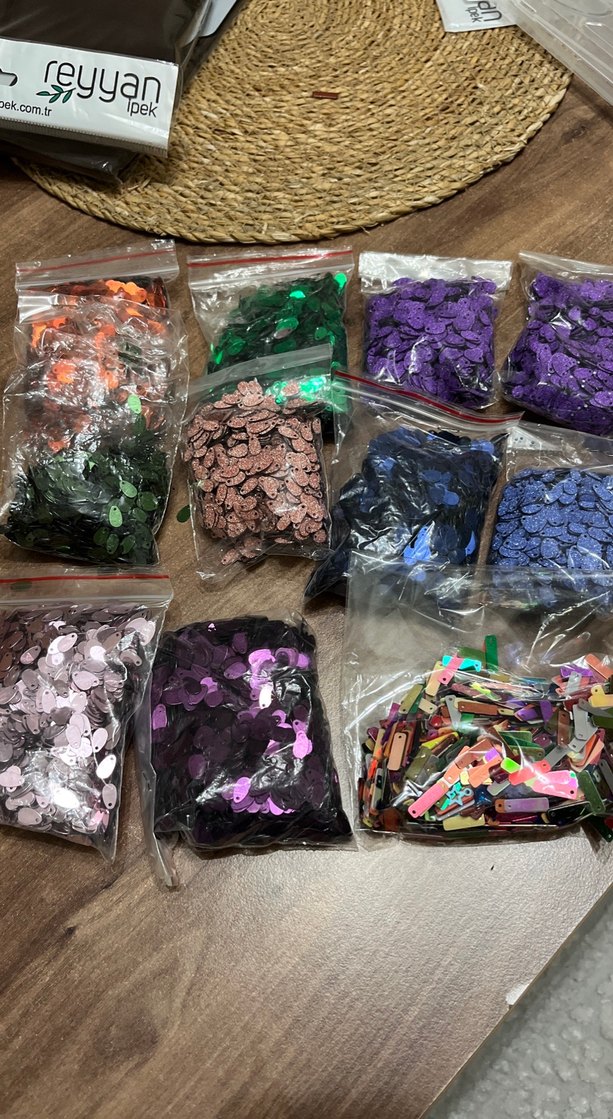 Çeşitli şekil ve renklerde pul ve boncuklar, küçük plastik torbalarda el sanatları için hazırlanmış.