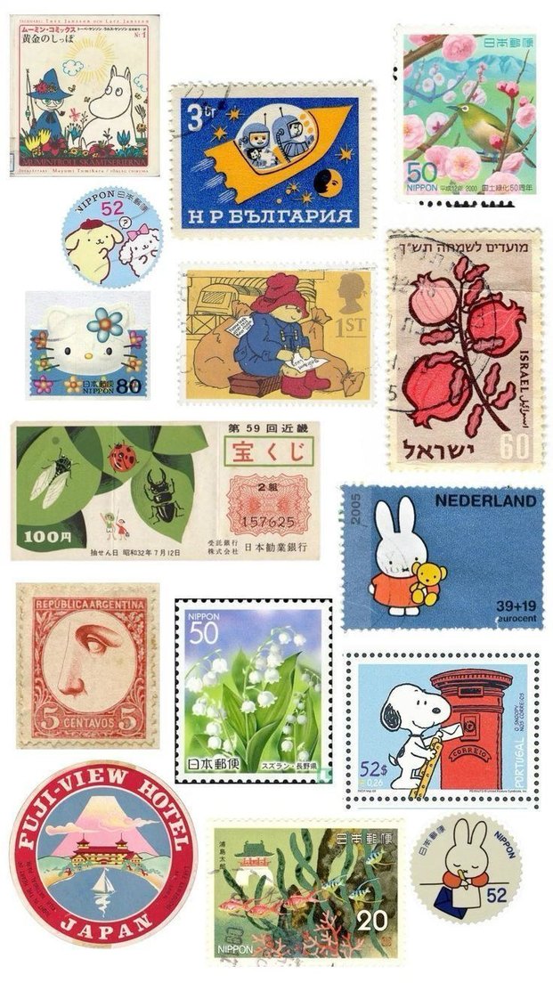 Farklı ülkelerden renkli pulların yer aldığı, doğa, hayvanlar ve kültür temalarını içeren sticker