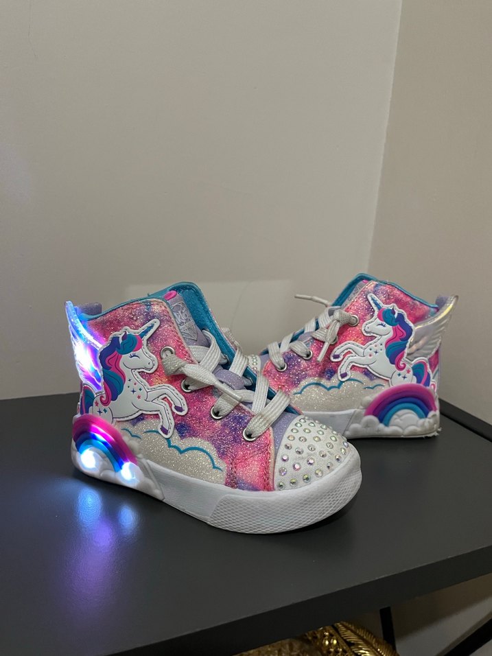 Pullu detaylar ve unicorn desenli renkli kız çocuk spor ayakkabısı. Kauçuk tabanlı, ışıklı ve rock punk tarzında.