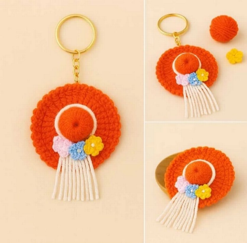 Bu bohem tarz anahtarlık, püsküller ve küçük çiçeklerle süslenmiş renkli tığ işi detaylara sahiptir.