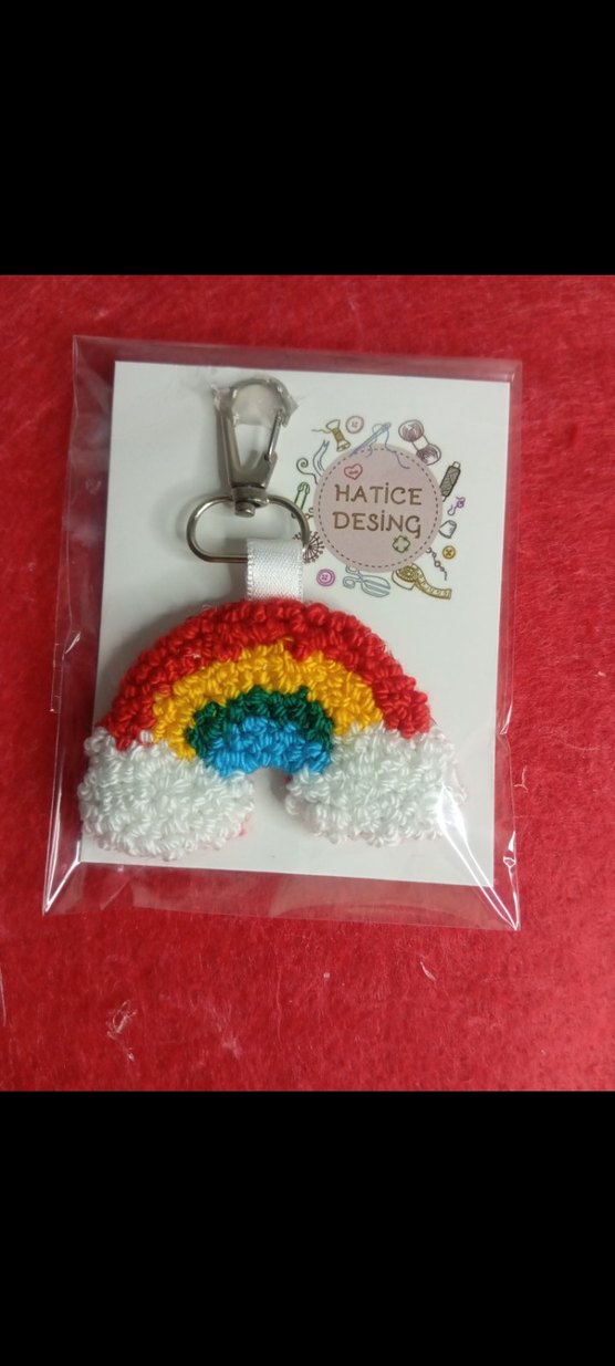 Püsküllü, renkli, tığ işi gökkuşağı desenli bohem anahtarlık. Metal klips ile kolayca takılabilir. Rahat ve retro tarzda.
