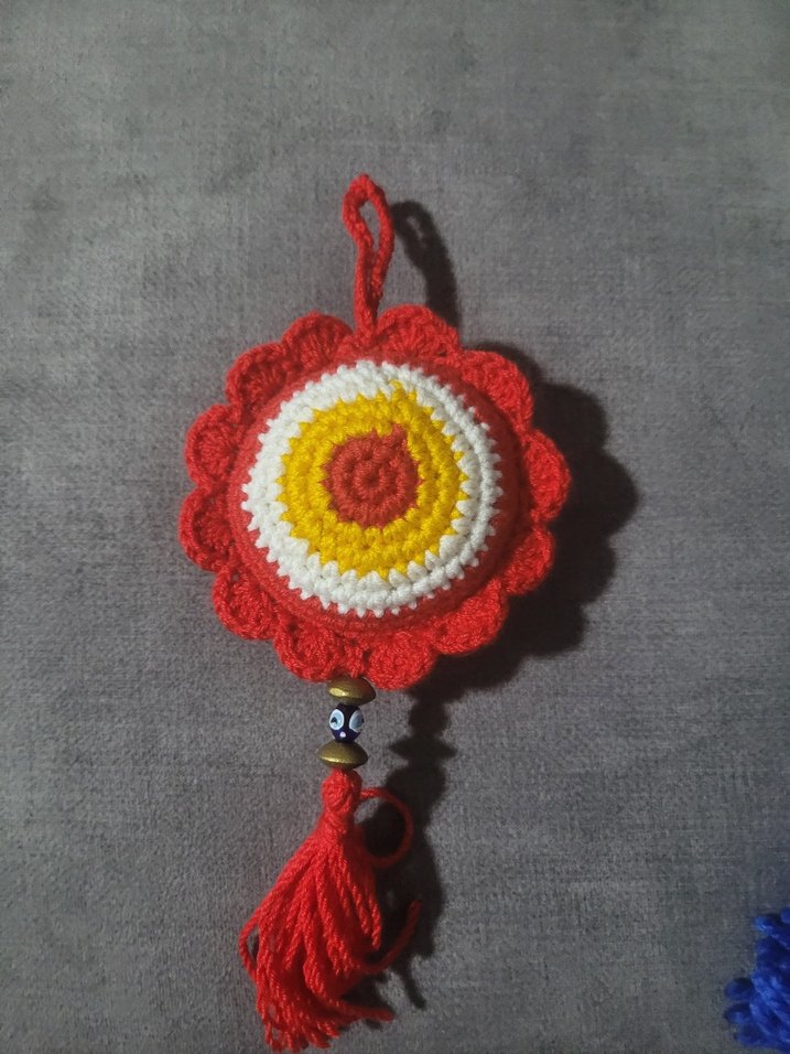 Renkli, yuvarlak tığ işi desene sahip püsküllü ve boncuklu bohem anahtarlık. Retro hippie tarzına uygun.