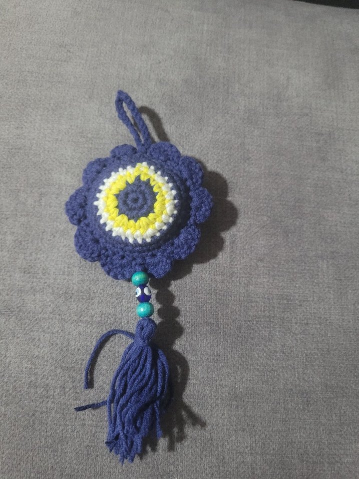 Püsküllü ve boncuk detaylı, renkli, örme çiçek tasarımlı bohem anahtarlık. Retro ve hippie stil için uygun.