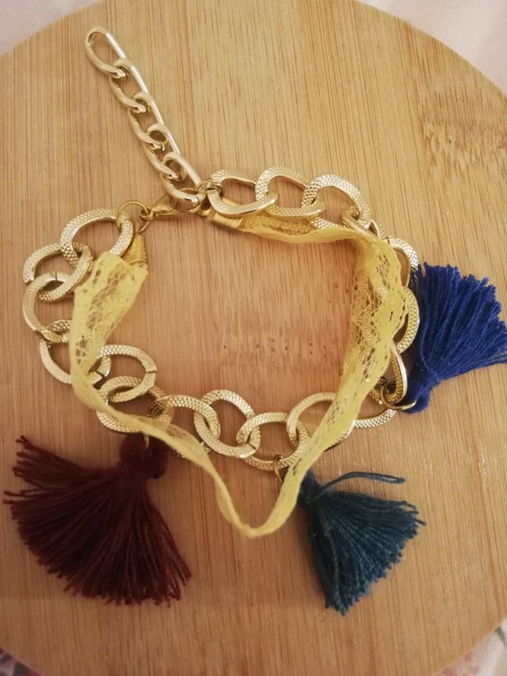 Renkli püsküller ve nakış detaylarıyla bohem tarzda, altın tonlu zincirli canlı bir bileklik