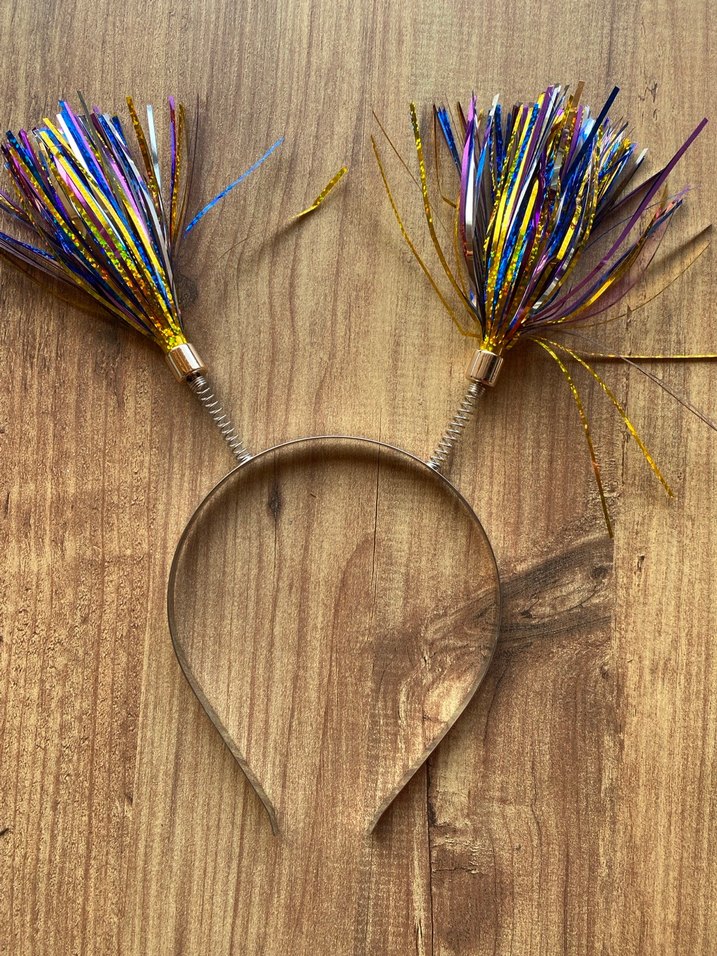 Püsküllü, tie-dye desenli renkli çocuk taç, bohem ve retro tarzı yansıtır.