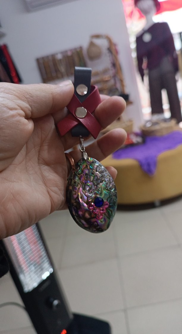 Gerçek Deniz kabuğundan yapılmış büyük işçilikle ve sworoski taşlarla islenmiş anahtarlık yada araç dikiz aynası süsü.Retro ve hippie stiline uygundur. Türkiye de tek yapılan üründür..Genelde Belediye başkanı vb kişilere hediye verilir...