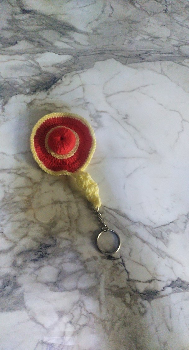 Kırmızı püsküllü, renkli ve bohem tarzda metal halkalı kadın anahtarlık. Retro ve hippie stillerine uygun.