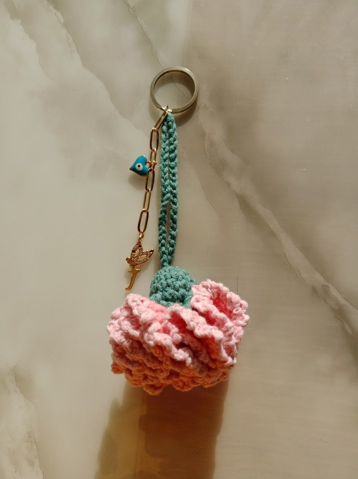 Bohem tarzda, örgülü saplı ve mavi nazar boncuğu ile küçük kuş figürlü renkli pembe püsküllü anahtarlık.