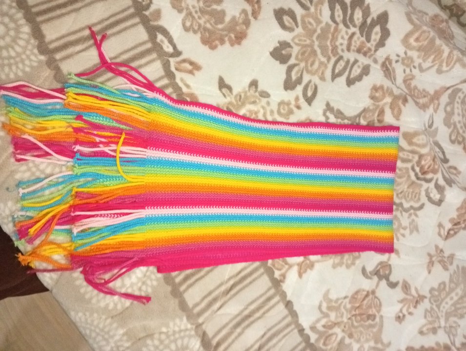 Renkli ve püsküllü örgü dokusuyla bohem tarzını yansıtan kadın şalı. Kıyafetlere canlılık katar.