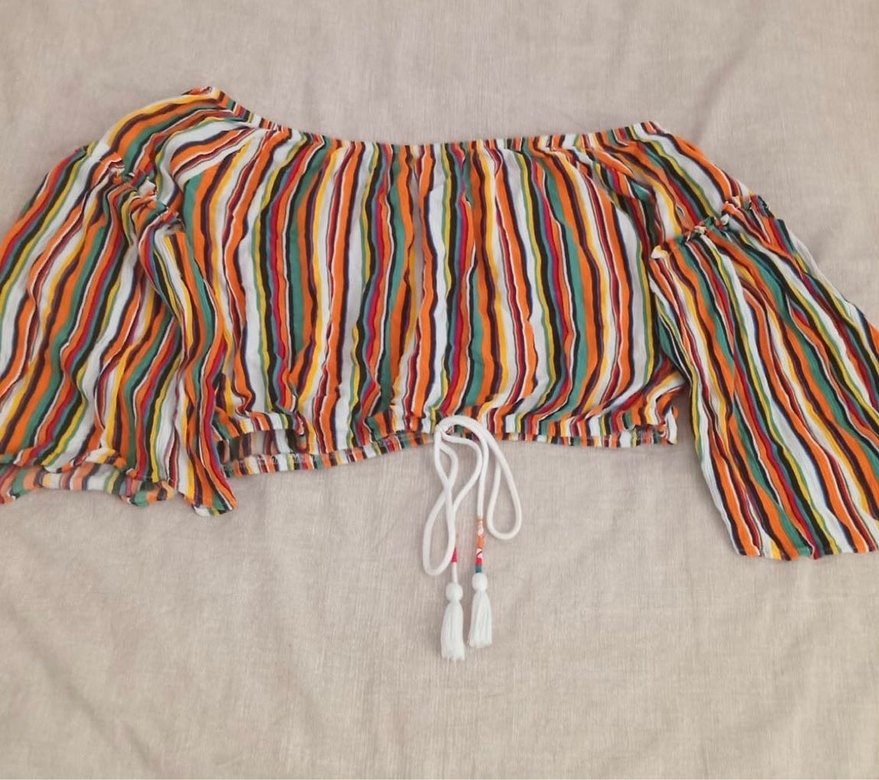 Renkli, tekne yaka ve askılı kollu bohem bluz. Püskül detayları ve bol kesimiyle kısa boyda, batik desenlidir. Günlük kullanım için uygundur.
