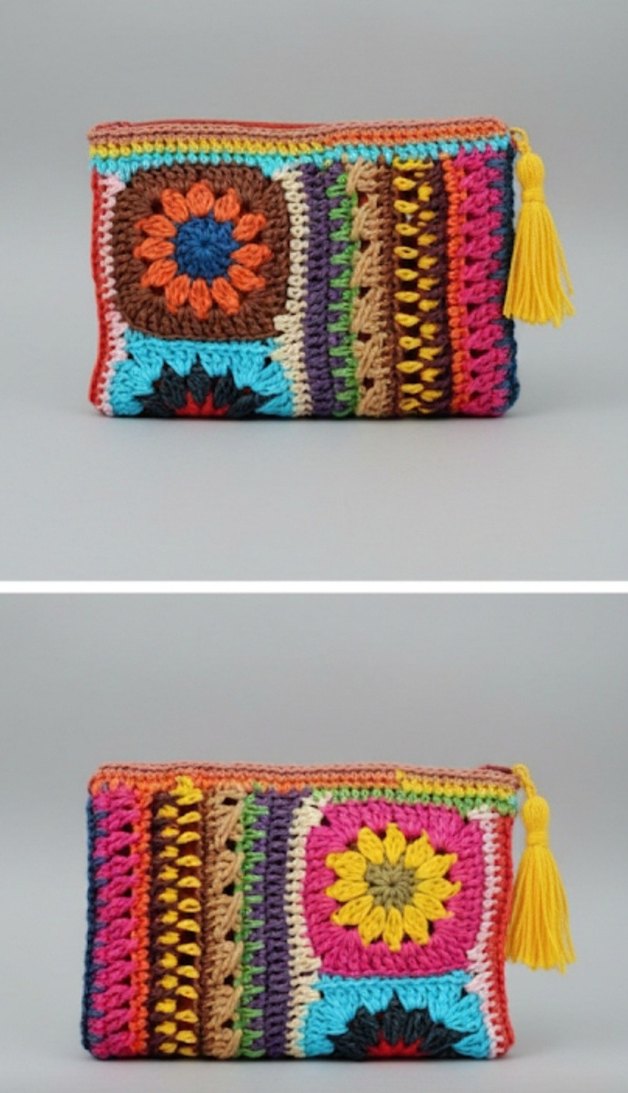 Renkli örgü clutch çanta, bohem desenli ve püsküllü, günlük kullanım için uygundur.