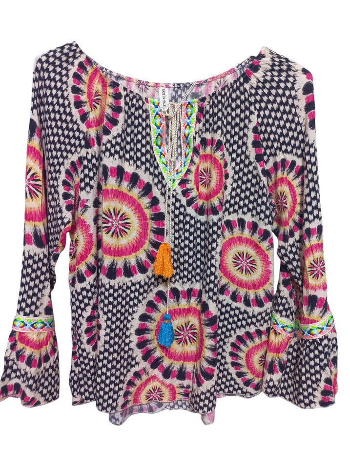 Renkli batik desenli, bol kesim ve uzun kollu bohem bluz. Yuvarlak yaka ve süslü püsküllerle günlük kullanım için uygundur. ✨