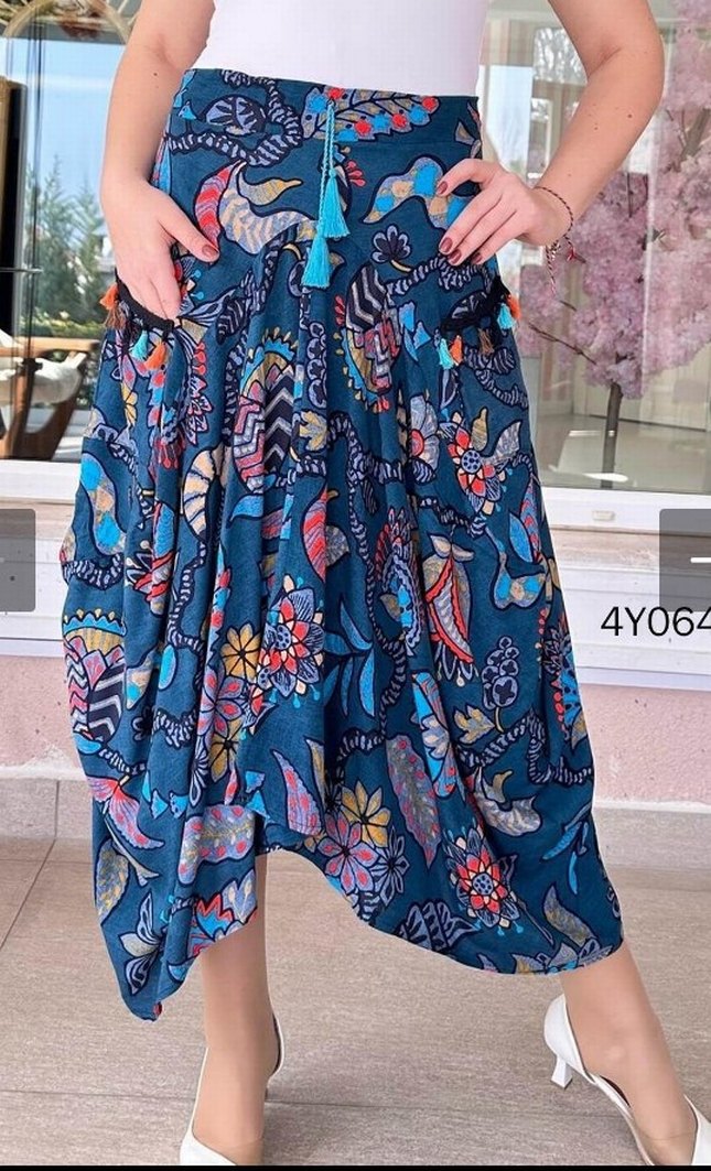 Hiç giyilmedi. Renkli ve bol kesim bohem etek, cep detaylı Yumuşak tekstil kumaştan üretilmiş olup püskül süslemelere sahiptir.