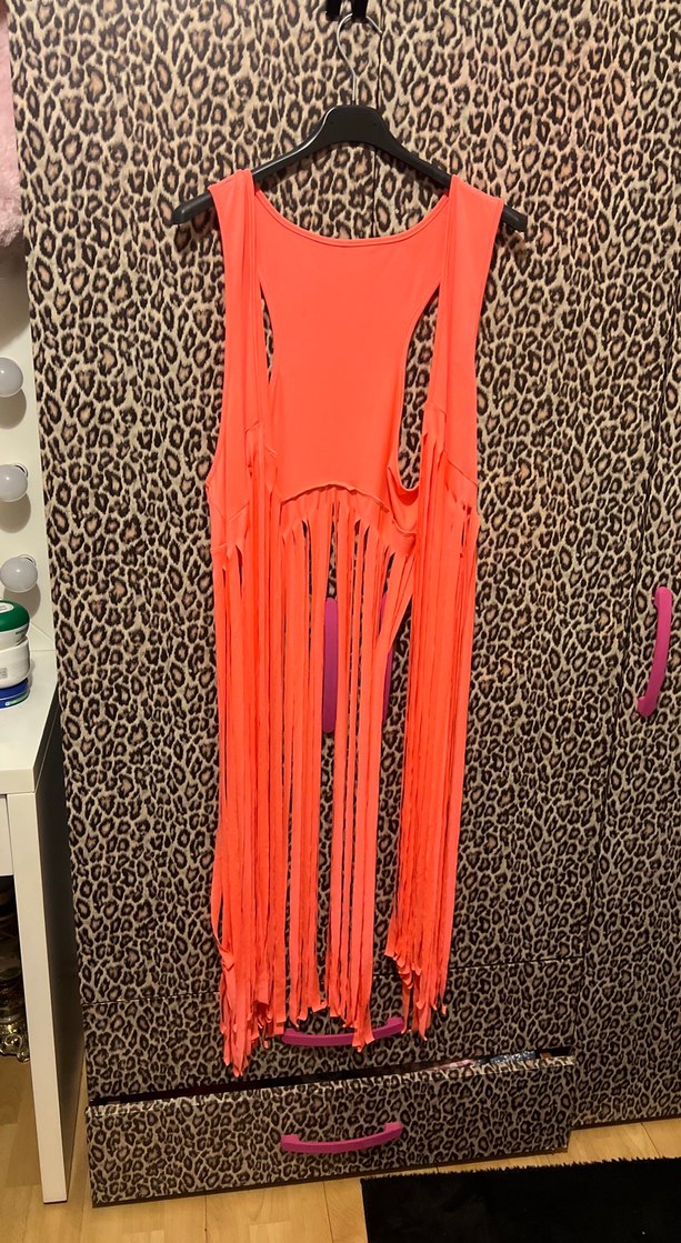 Renkli, kolsuz, straplez ve ince oturan bu yelek uzun püsküllere sahip, sentetik kumaştan yapılmıştır. Bohem parti stiline uygundur.
