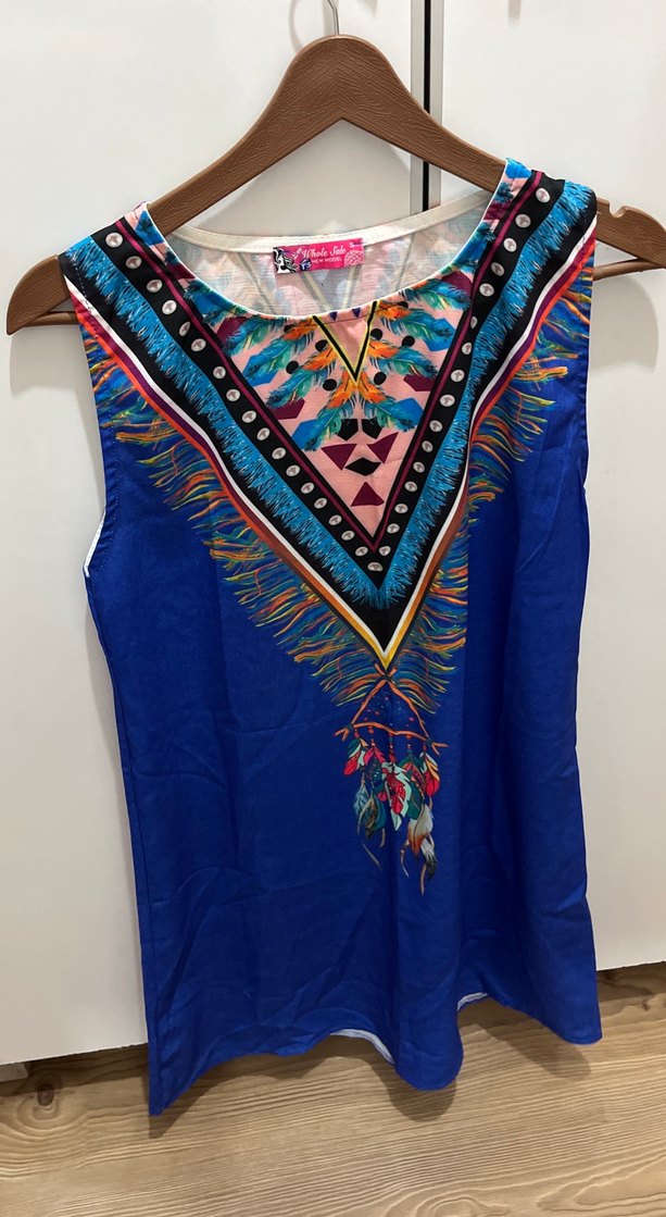Kolsuz, renkli tie-dye desenli ve püsküllü bohem tunik. V yakalı, bol ve uzun kesim, sentetik kumaştan yapılmıştır.