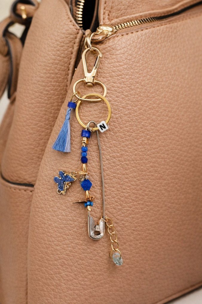 Mavi püsküllü, boncuklu ve altın detaylı renkli canta charm , bohem ve avangart tarzı yansıtıyor. #charm #cantaaksesuarı #cantacharmı ️