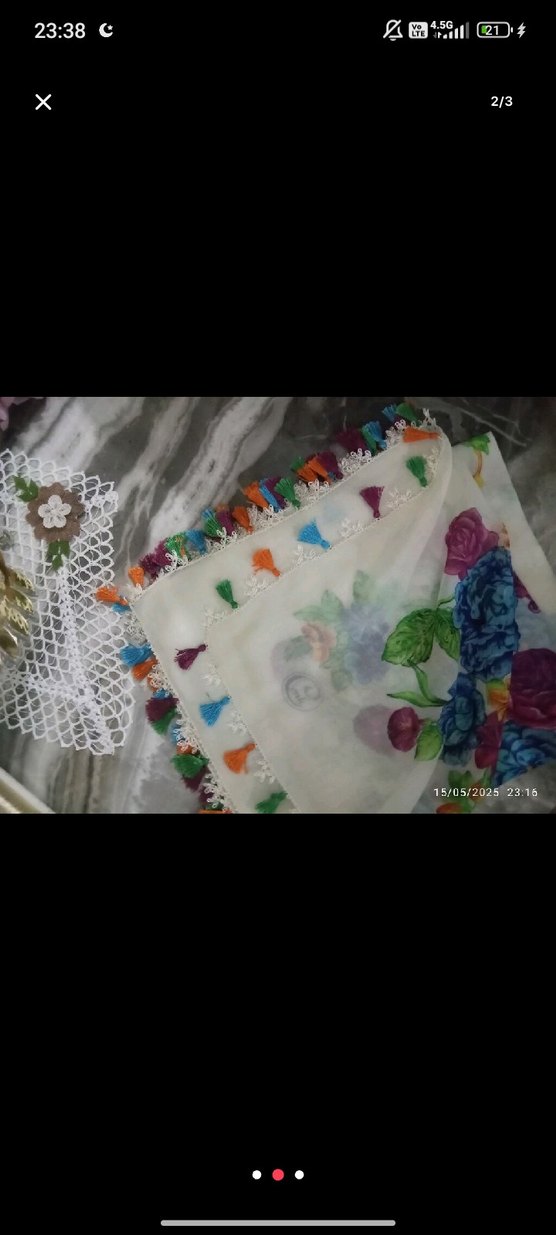 Hafif tekstil kumaştan, dantel kenar ve renkli püsküllerle süslenmiş, bohem çiçek desenli şal. Bohem ve retro tarzlara uygundur.