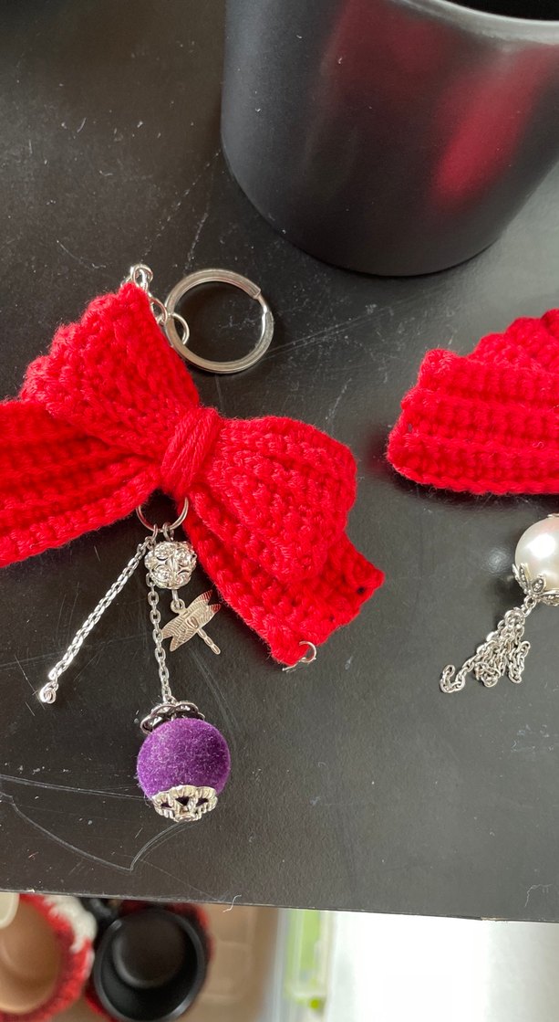 Renkli kırmızı örgü fiyonk ve püskül detaylarıyla kadın anahtarlık, rahat ve bohem bir tarz sunar.