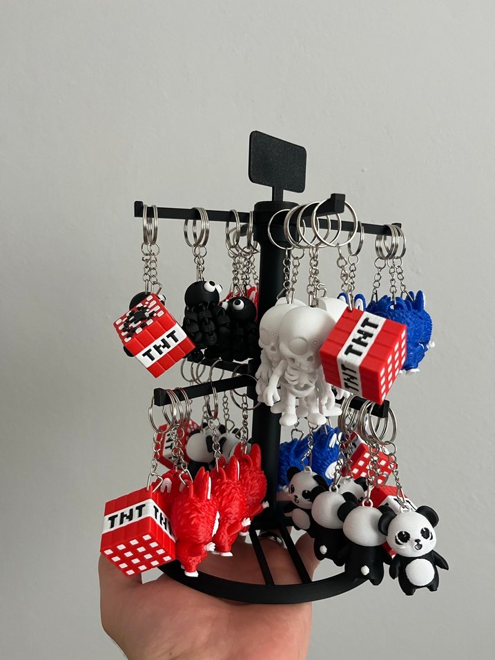 Püsküllü, renkli ve avant-garde tasarımlı anahtarlıklar; kafatası, TNT kutusu ve panda figürleri içerir. Toptan alım için dm