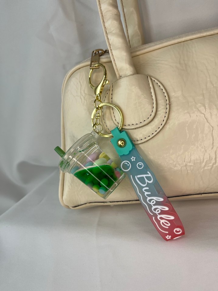 Renkli ve püsküllü kadın anahtarlık, baloncuk temalı detaylarla bohem ve retro tarzı yansıtıyor.