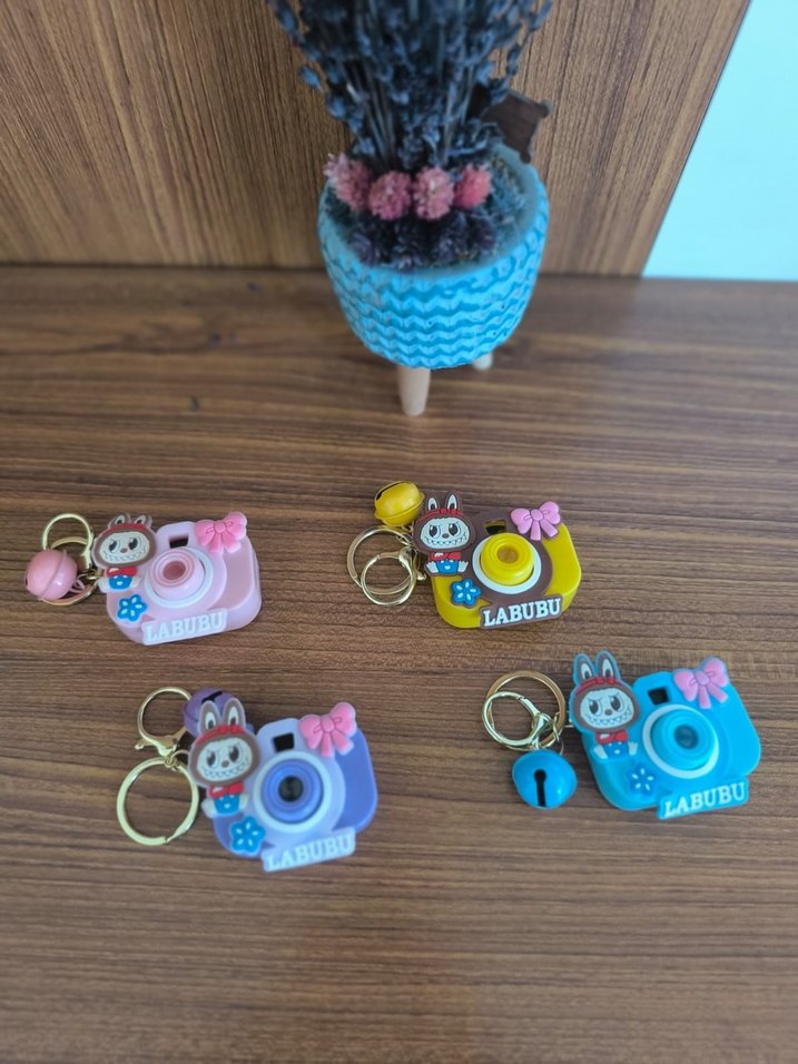 Püsküllü ve renkli kamera tasarımlı anahtarlıklar, LABUBU ve ABUBU yazılı, bohem ve retro tarzlar için uygun.
