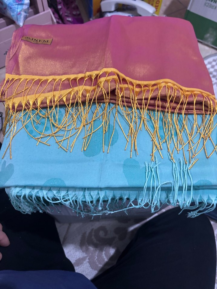 Renkli ve ipeksi dokulu kadın şal, püsküllerle süslenmiş, bohem tarzı için uygundur.