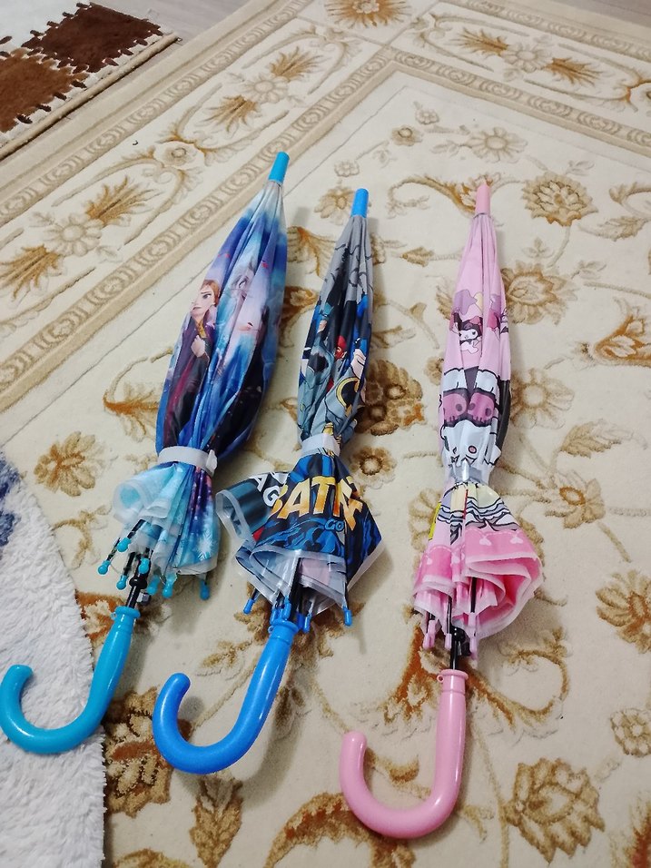 Pop kültür desenli, püsküllü, renkli kadın şemsiyeleri mavi ve pembe kıvrık saplıdır.